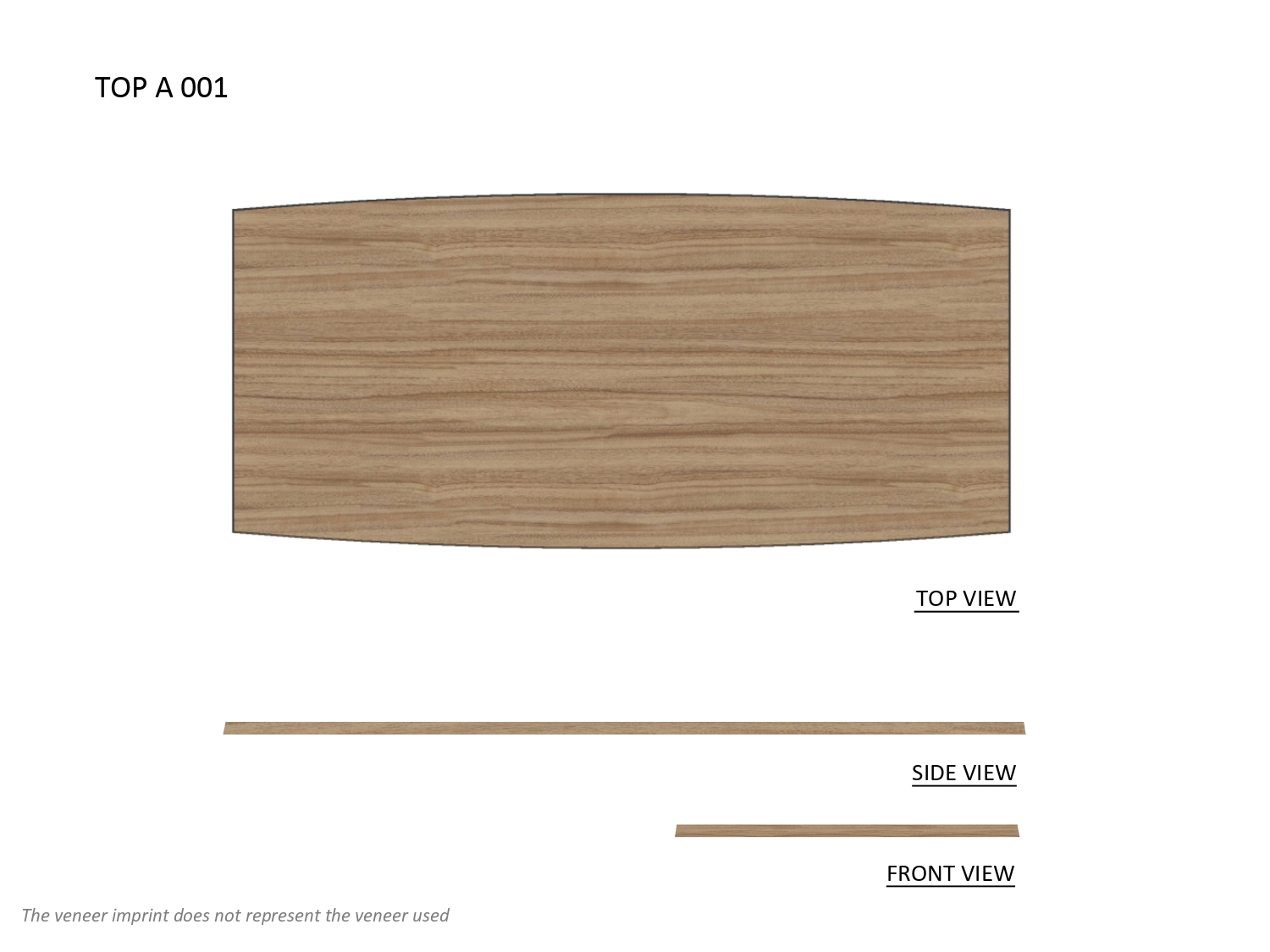 Table with curved rectangular top with 10 degree edge in veneer wood or lacquer or solid wood and base in solid with metal detail.