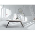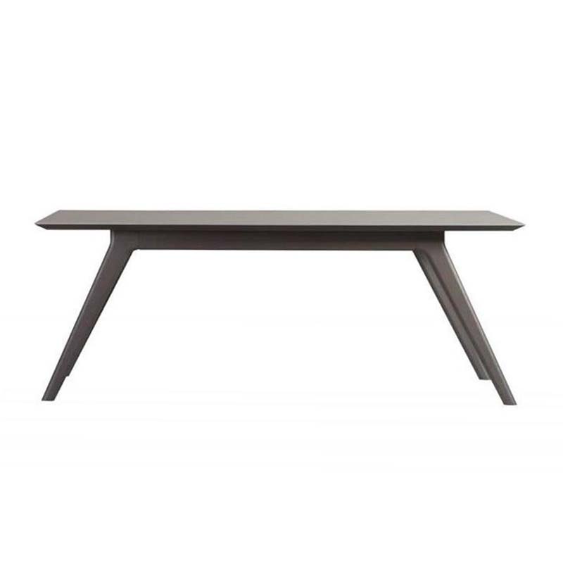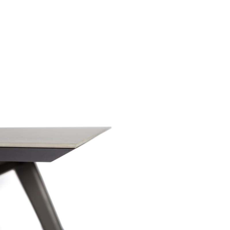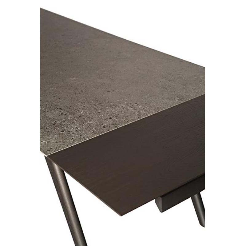 Table with rectangular thin edge top in ceramic maxfine and base in solid wood.
