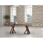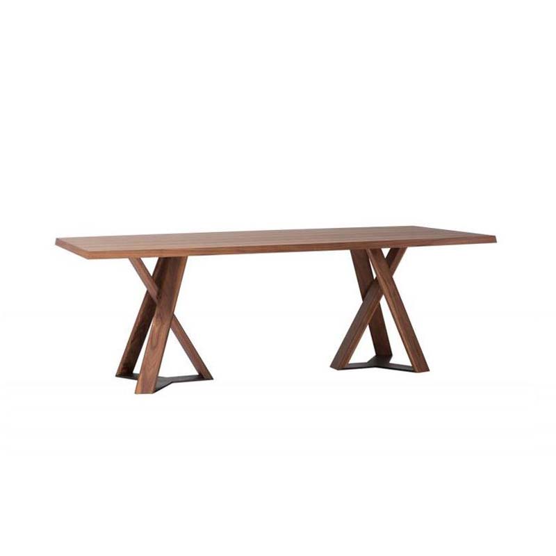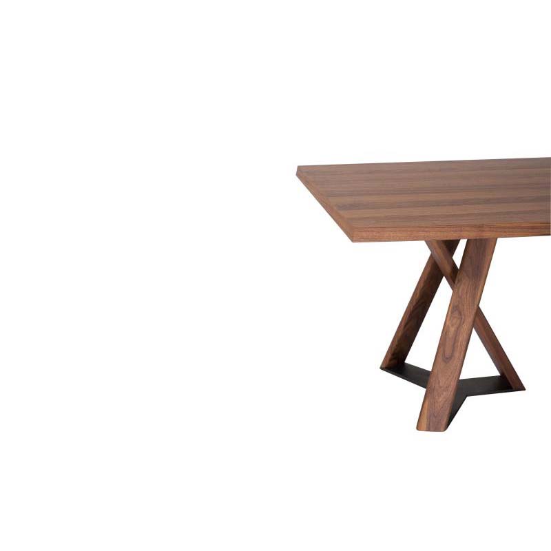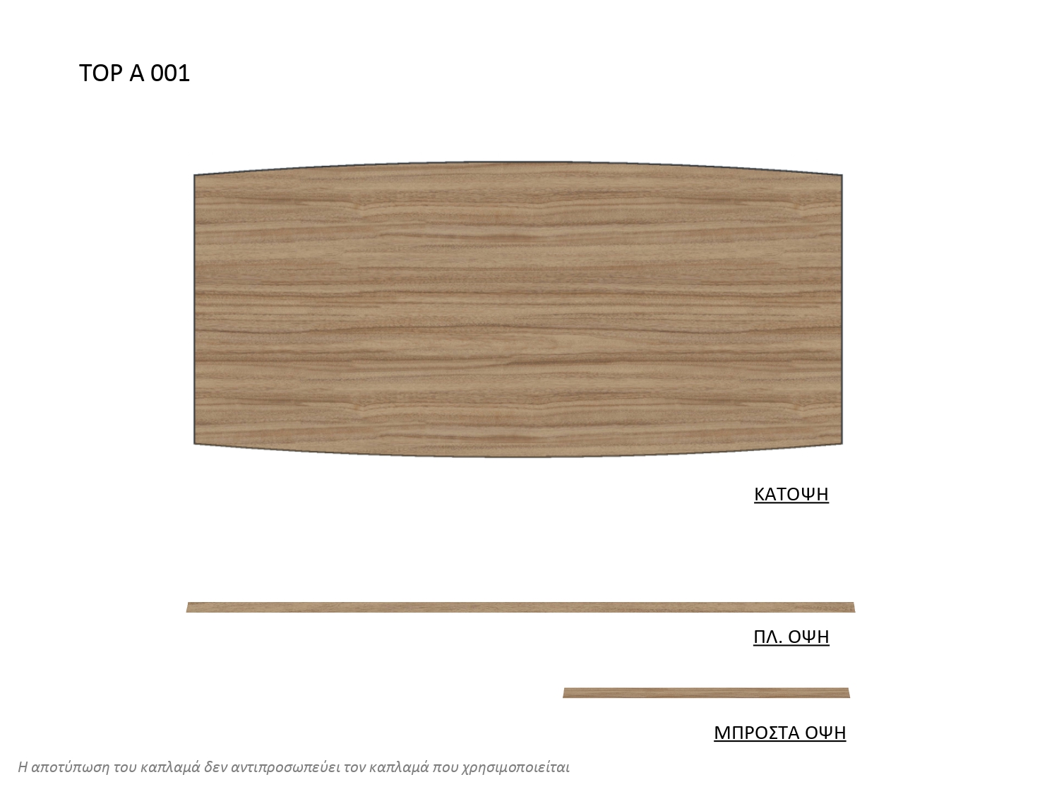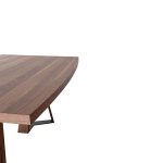 Τραπέζι με καμπύλο παραλληλόγραμμο καπάκι με 10 μοίρες φάλτσο από καπλαμά ξύλου ή μασίφ ξύλο και βάση από μασίφ ξύλο με μεταλλική λεπτομέρεια.