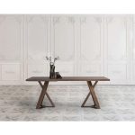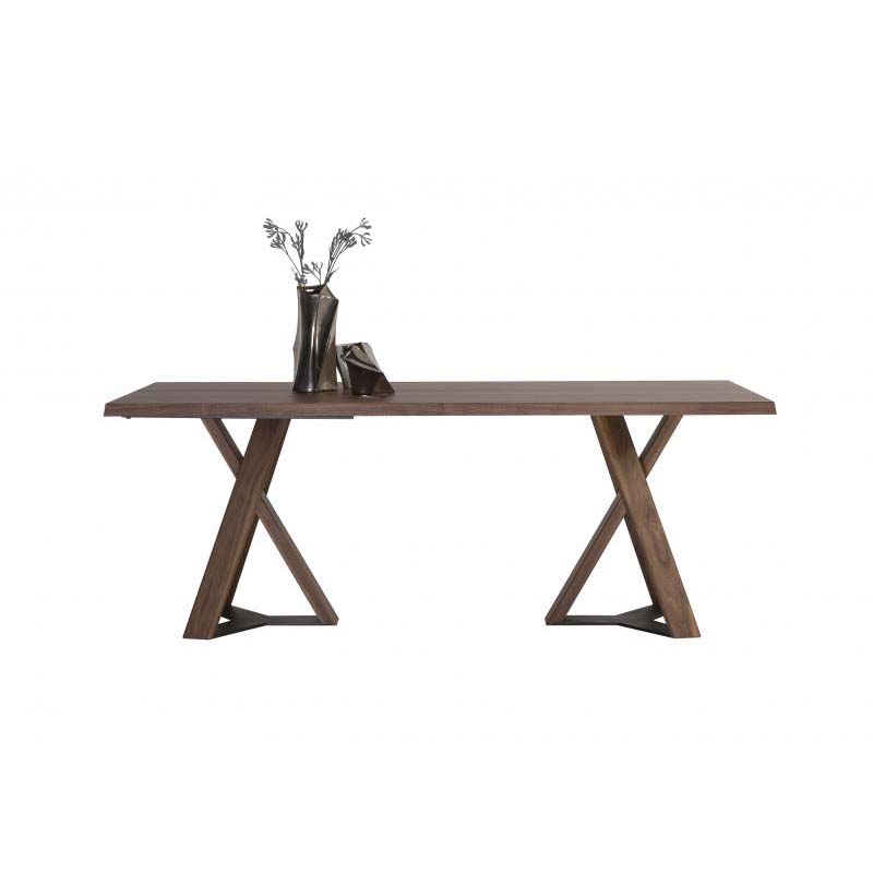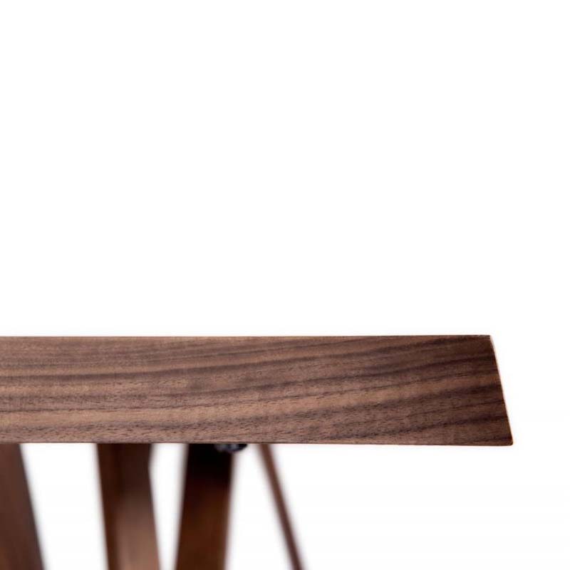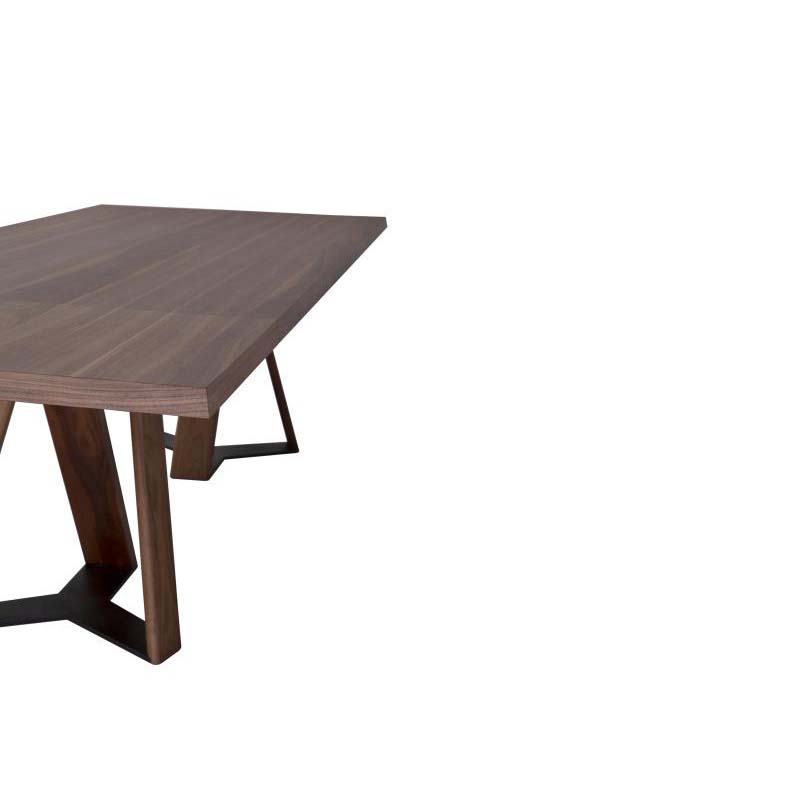 Τραπέζι με παραλληλόγραμμο καπάκι με 10 μοίρες φάλτσο από καπλαμά ξύλου ή μασίφ ξύλο και βάση από μασίφ ξύλο με μεταλλική λεπτομέρεια.
