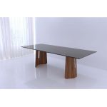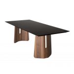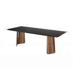 Τραπέζι με παραλληλόγραμμο φάλτσο καπάκι από κεραμικό maxfine και βάση από καμπυλωτό ξύλινο ηψίσυχνο .
