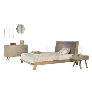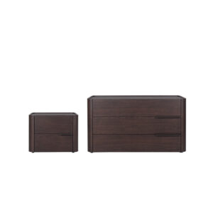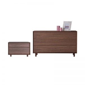Bedside and chest of drawers in veneer wood or lacquer and legs in solid wood.
