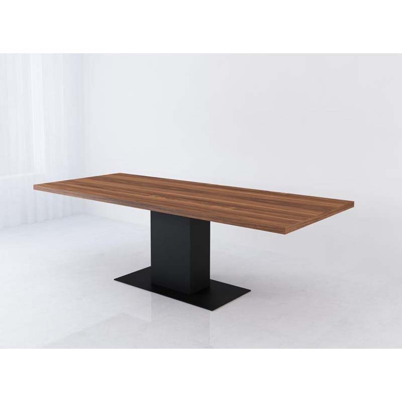 Table with rectangular top with straight edge in veneer wood or lacquer or solid wood and metal base.