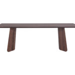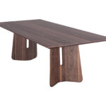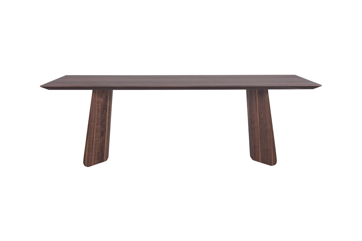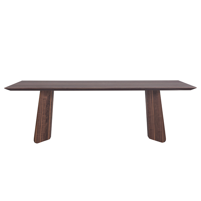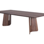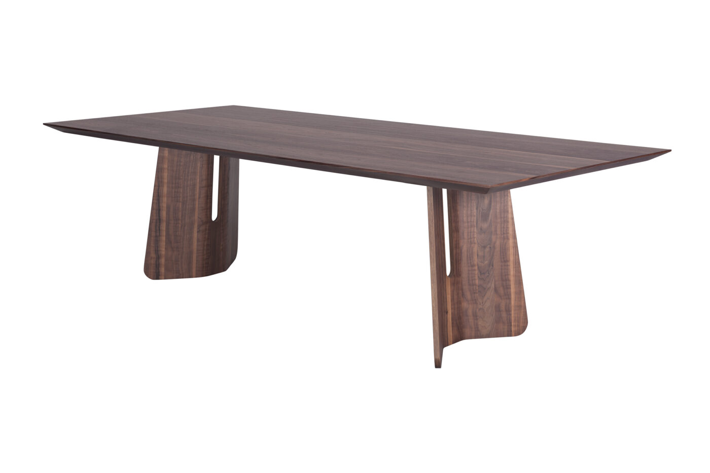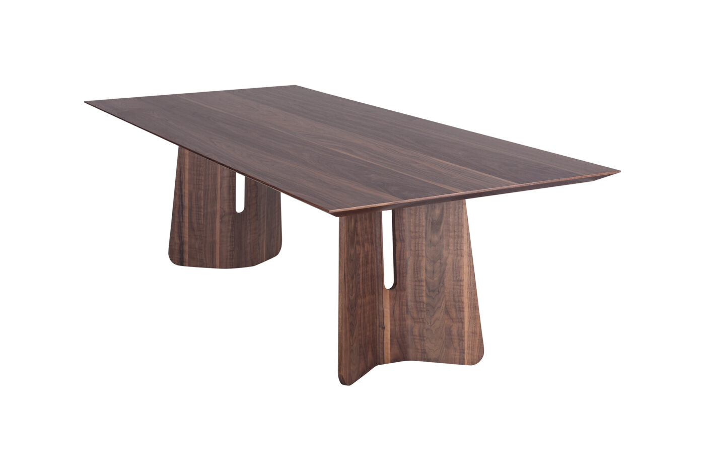 Table with rectangular thin edge top in veneer wood or lacquer or solid wood and wooden curved plywood base.