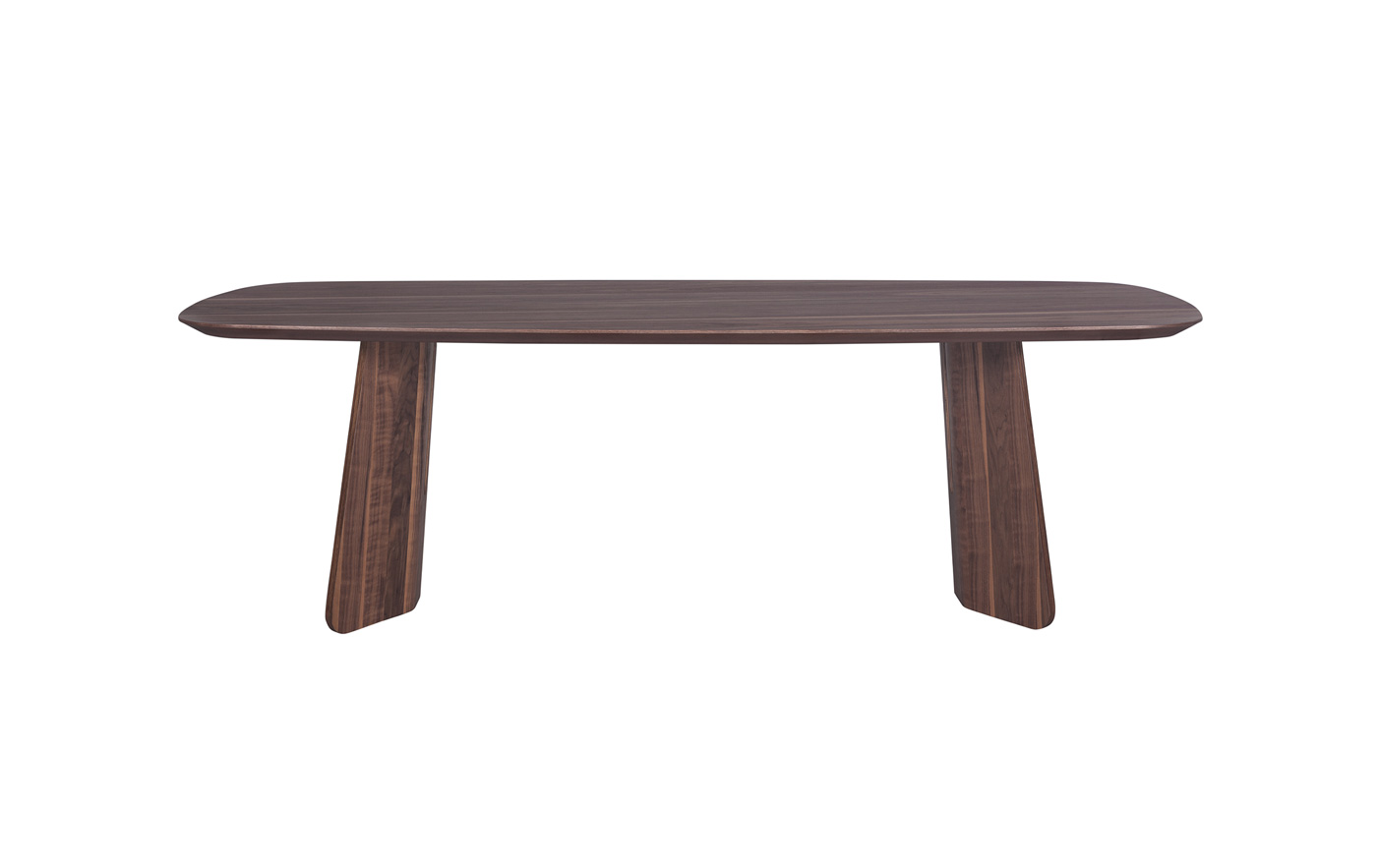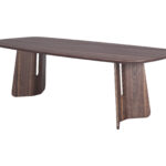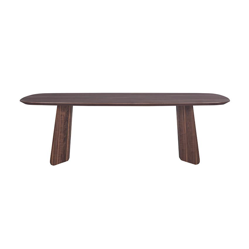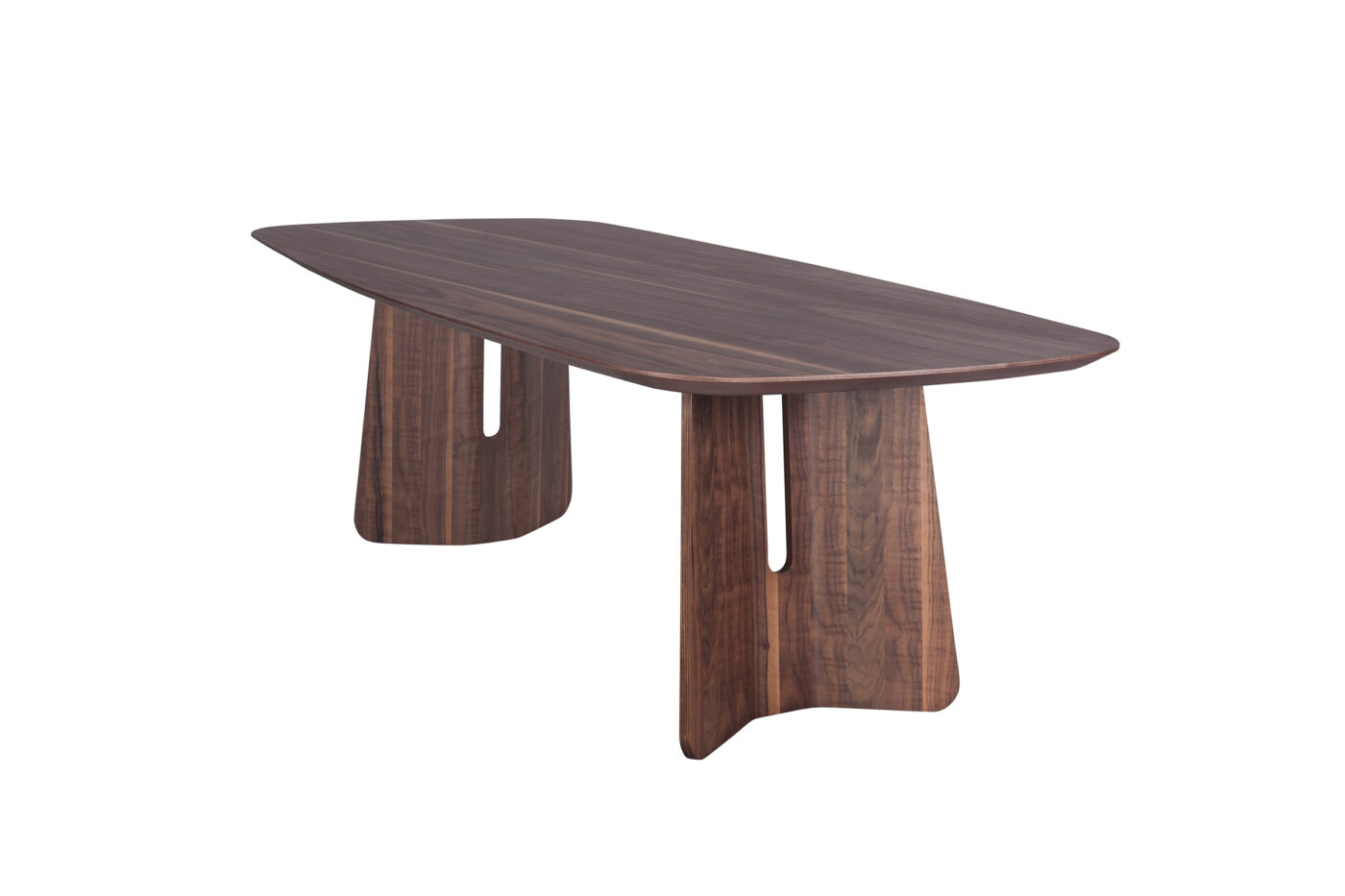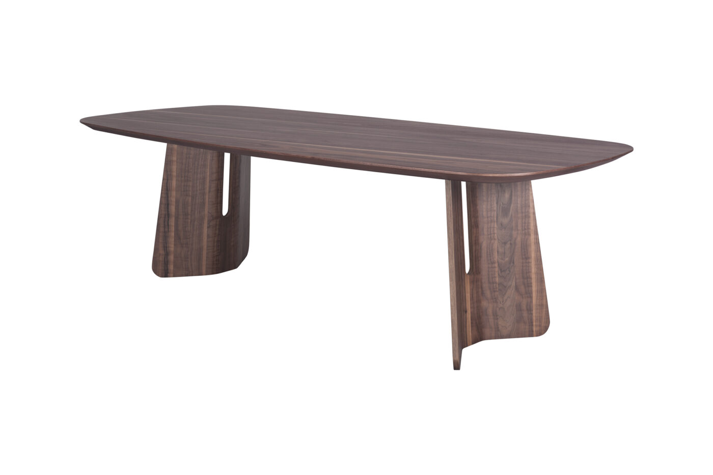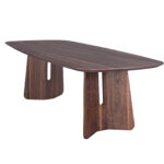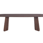 Table with oval thin edge top in veneer wood or lacquer or solid wood and wooden curved plywood base.