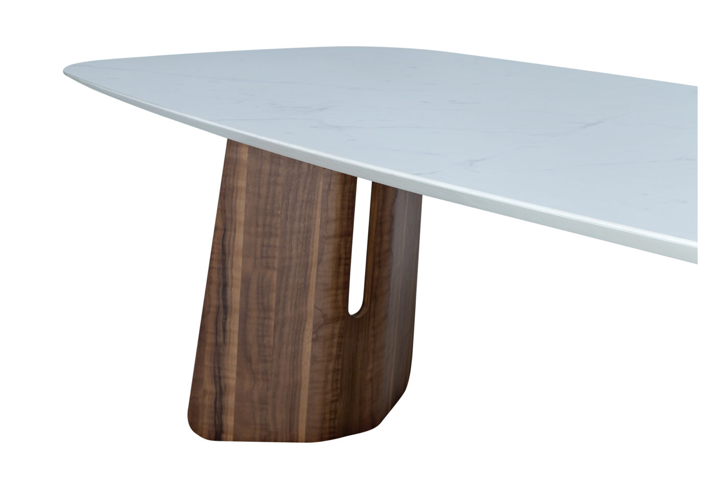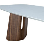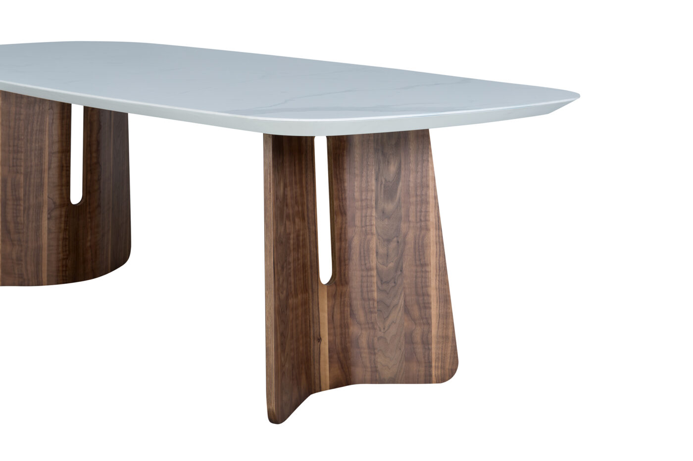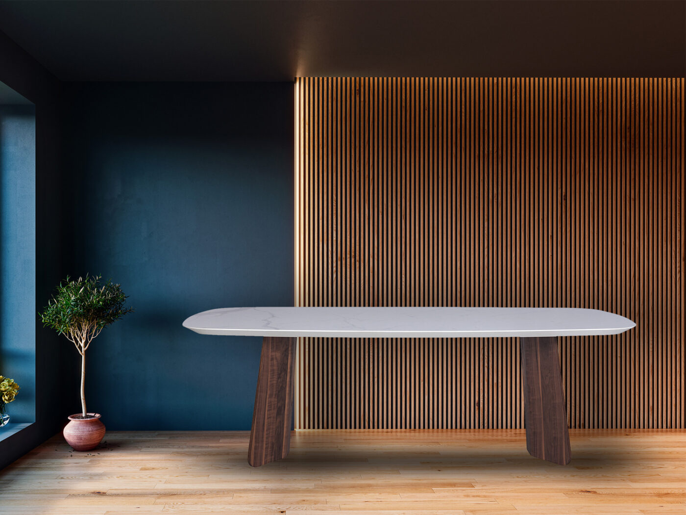 Table with oval thin edge top in ceramic maxfine and wooden curved plywood base.