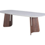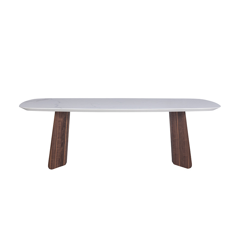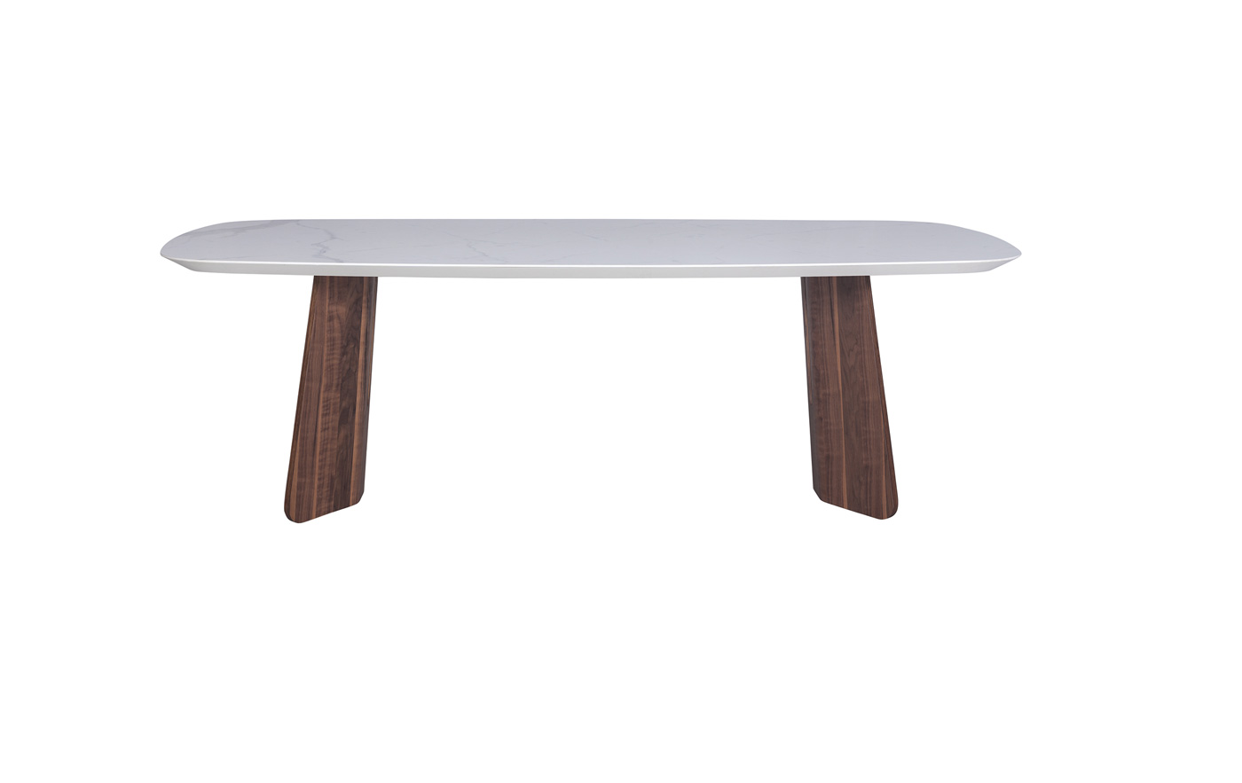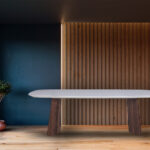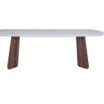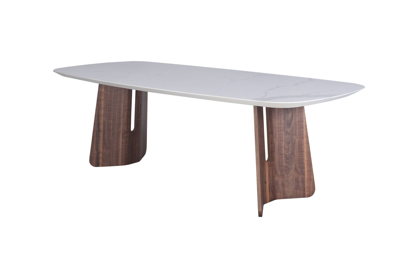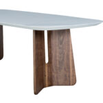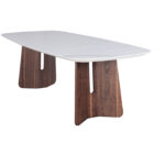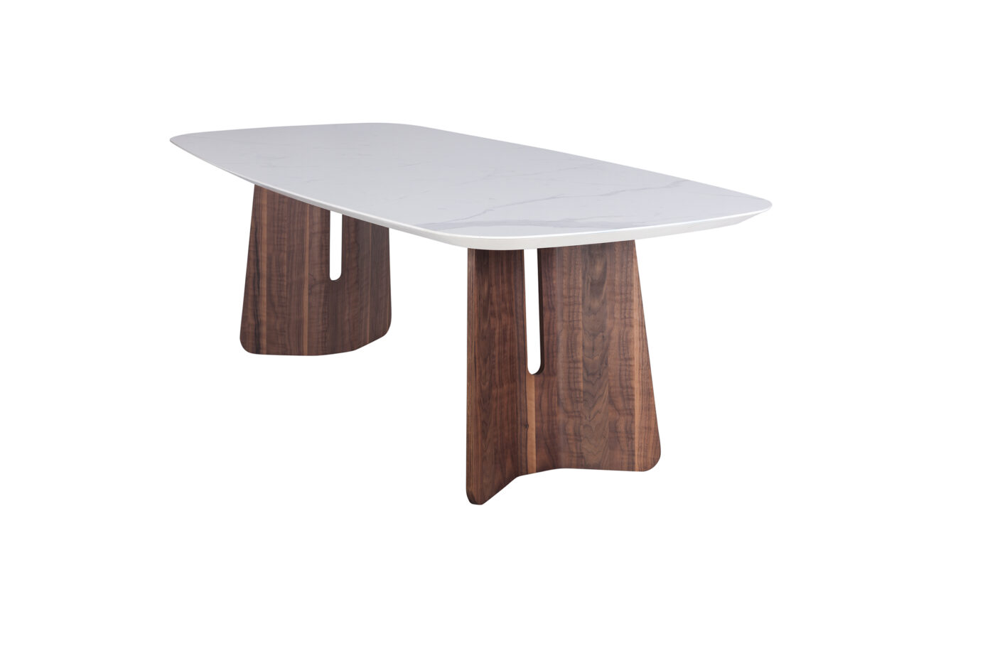 Table with oval thin edge top in ceramic maxfine and wooden curved plywood base.