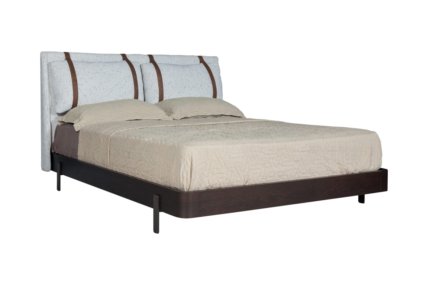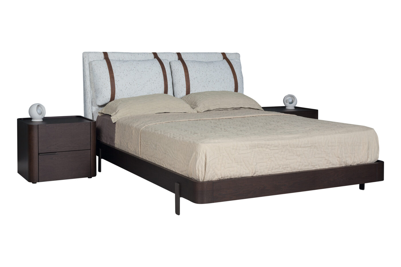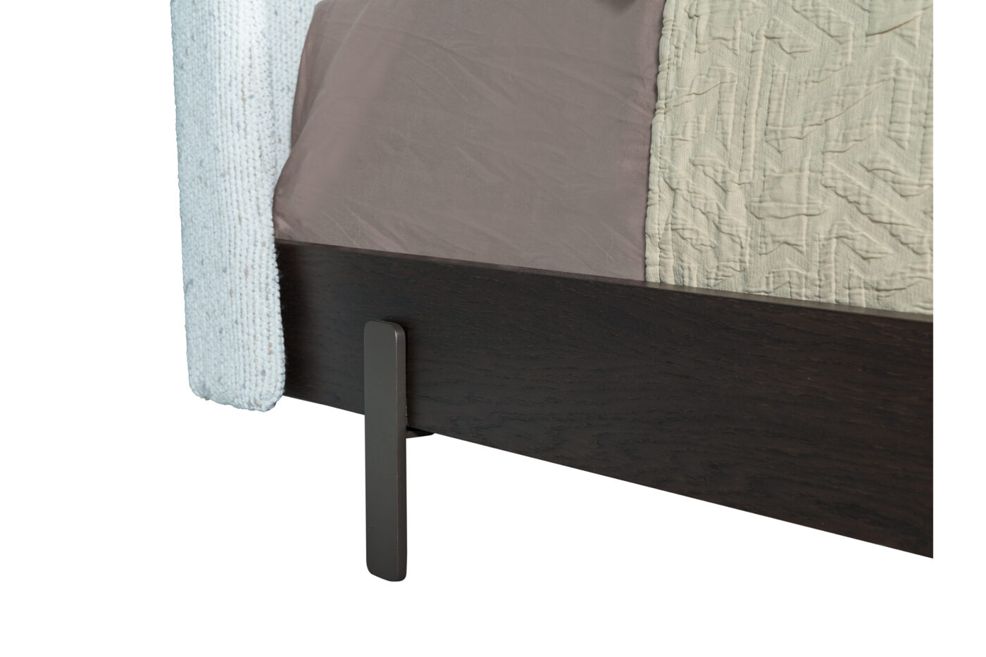 Bed with fabric headboard and wooden frame in veneer or lacquer with metal legs.