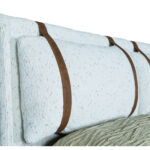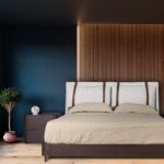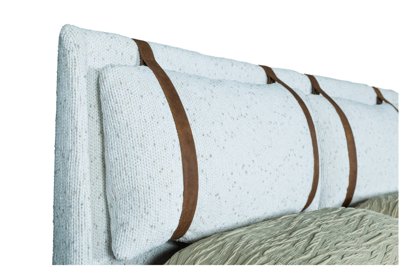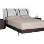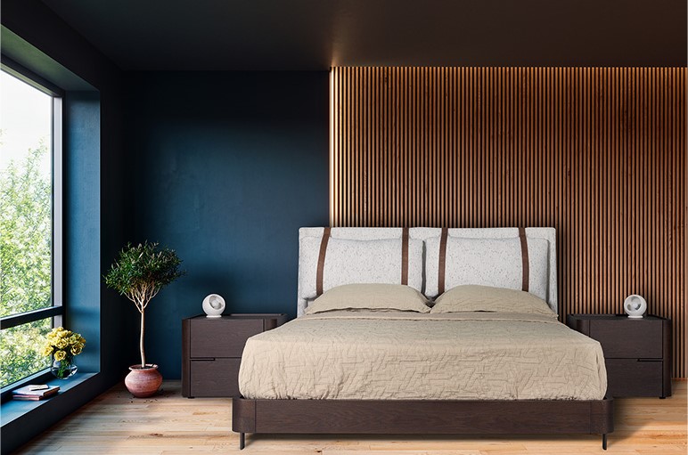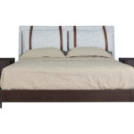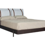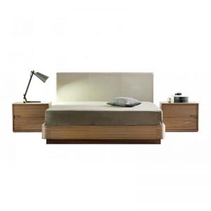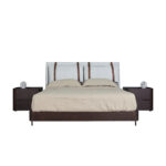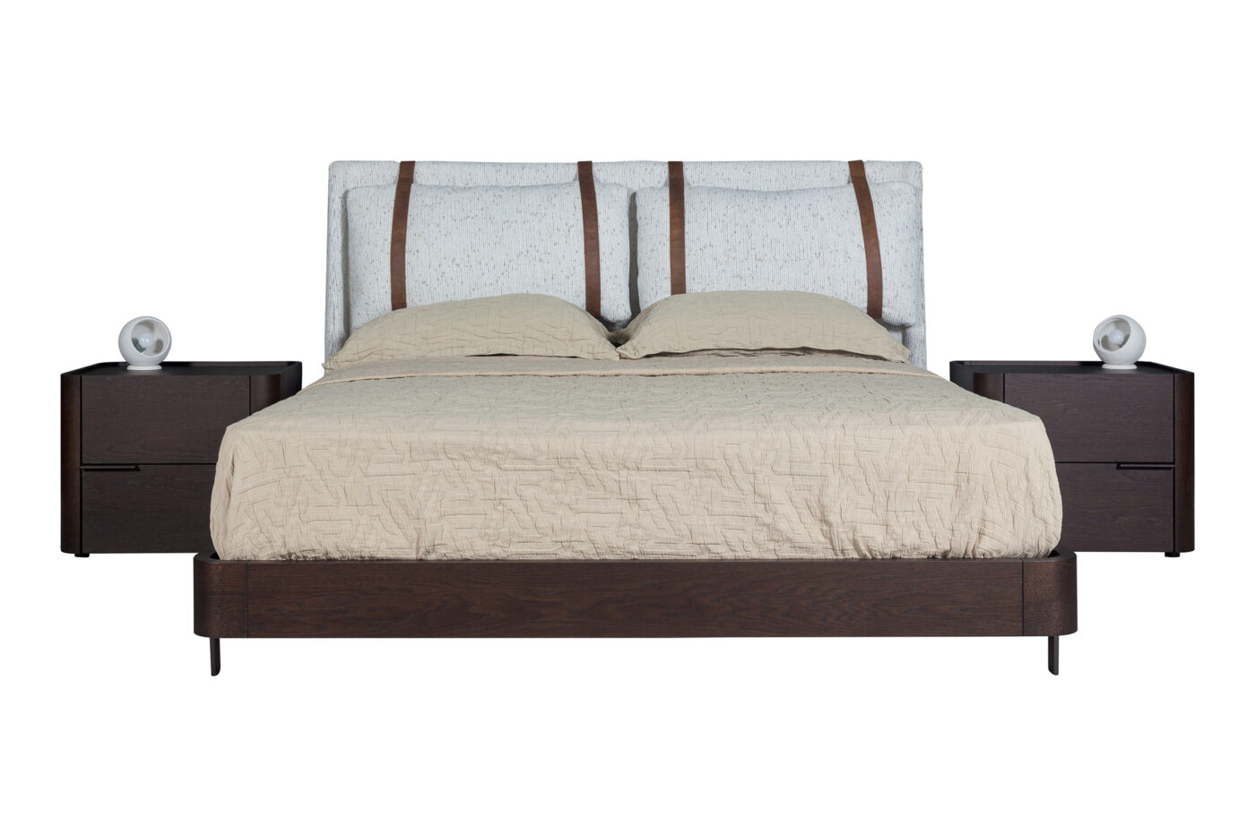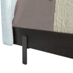 Bed with fabric headboard and wooden frame in veneer or lacquer with metal legs.