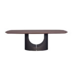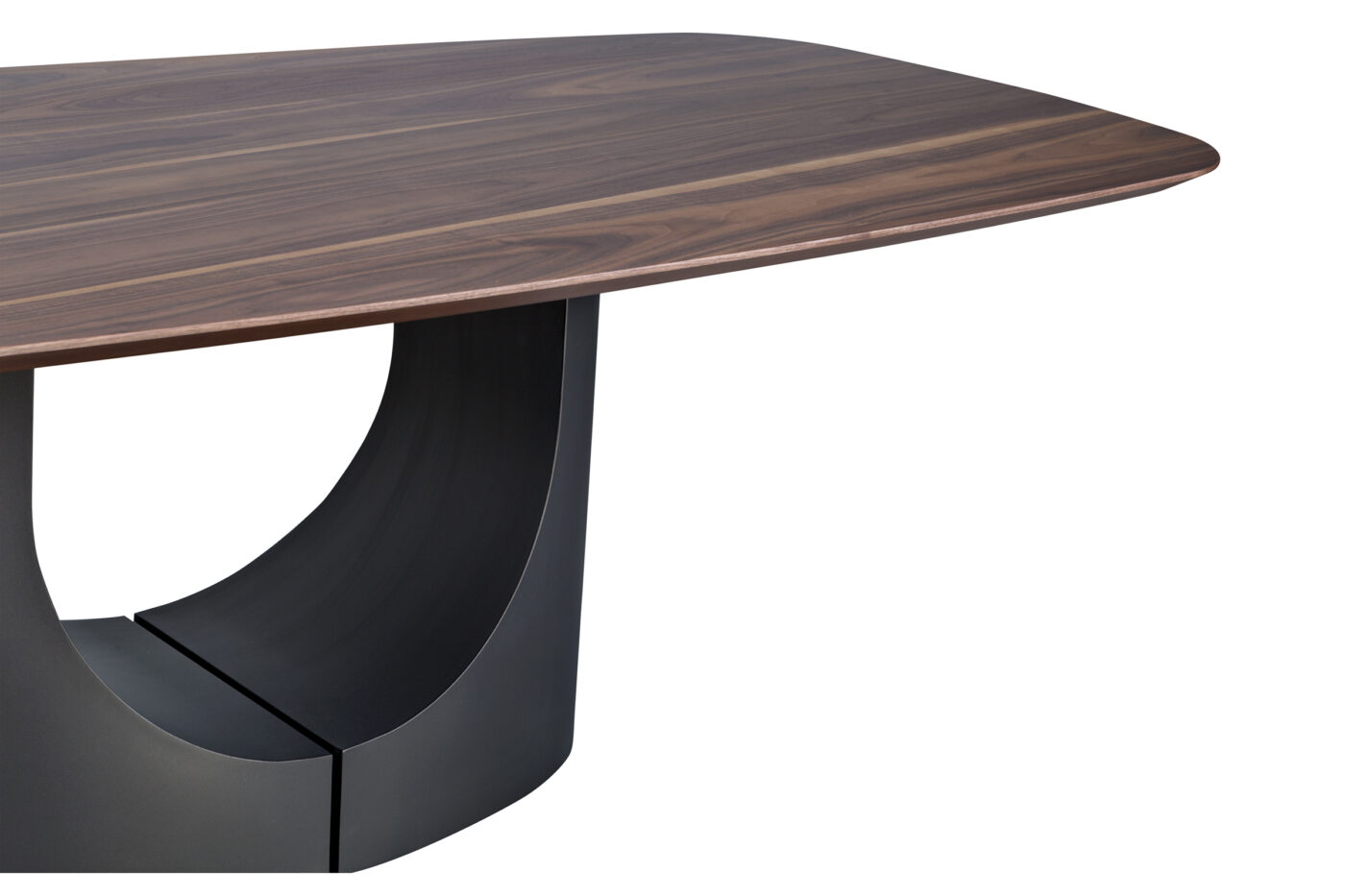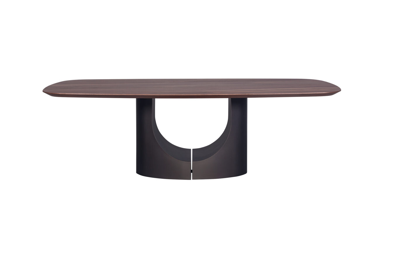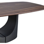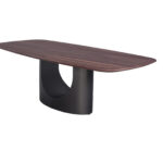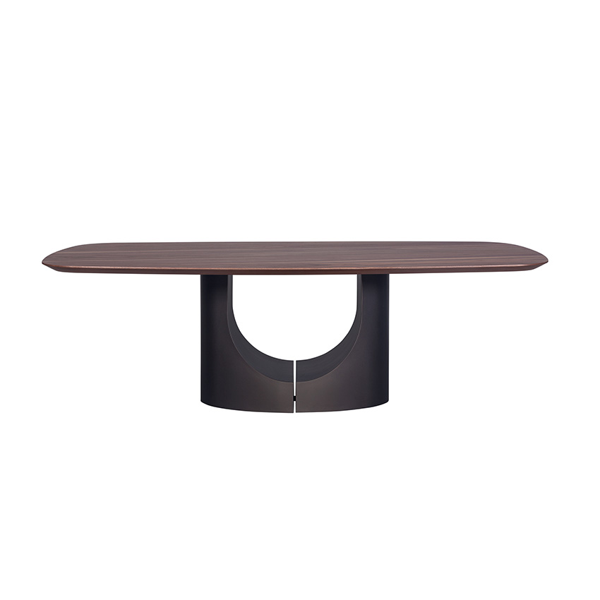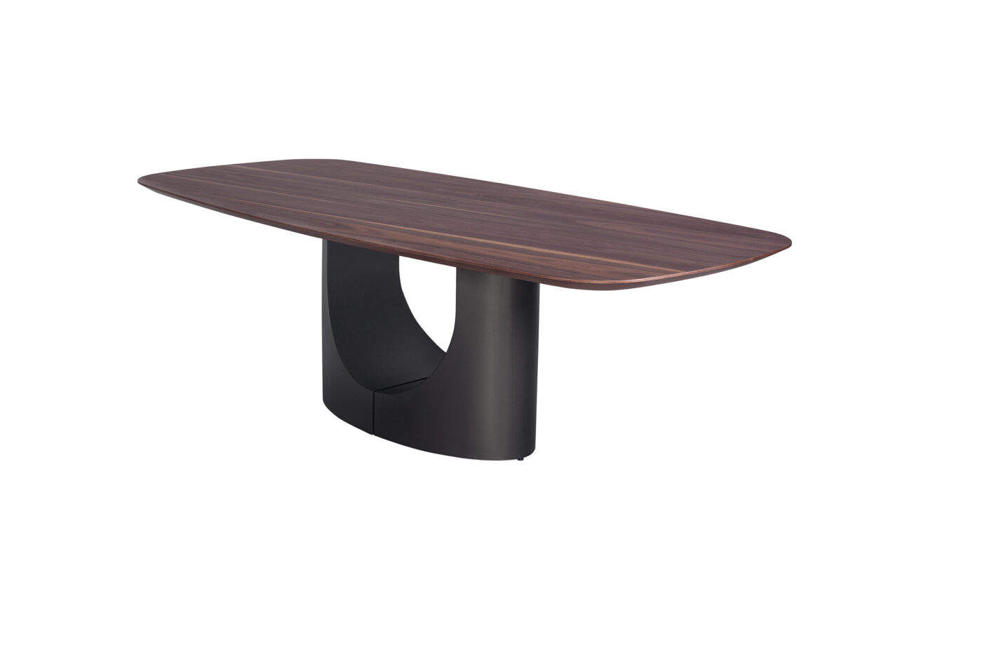 Table with oval thin edge top in veneer wood with diagonal veins and metal base.