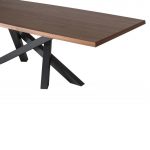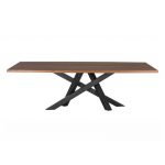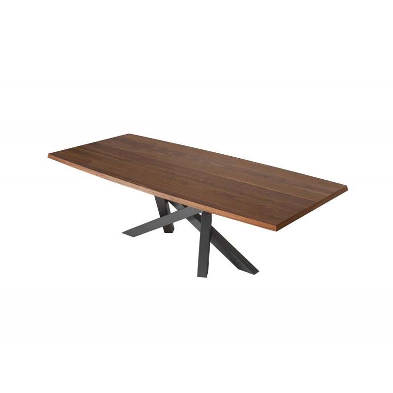 Table with curved rectangular top with 10 degree edge in veneer wood or lacquer or solid wood and metal base.