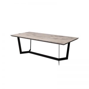 Τραπέζι με καμπύλο παραλληλόγραμμο καπάκι με 10 μοίρες φάλτσο από καπλαμά ξύλου ή μασίφ ξύλο και βάση από μασίφ ξύλο με μεταλλική λεπτομέρεια.