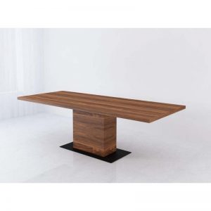 Τραπέζι με παραλληλόγραμμο καπάκι με 10 μοίρες φάλτσο από καπλαμά ξύλου ή μασίφ ξύλο και βάση από μασίφ ξύλο με μεταλλική λεπτομέρεια.