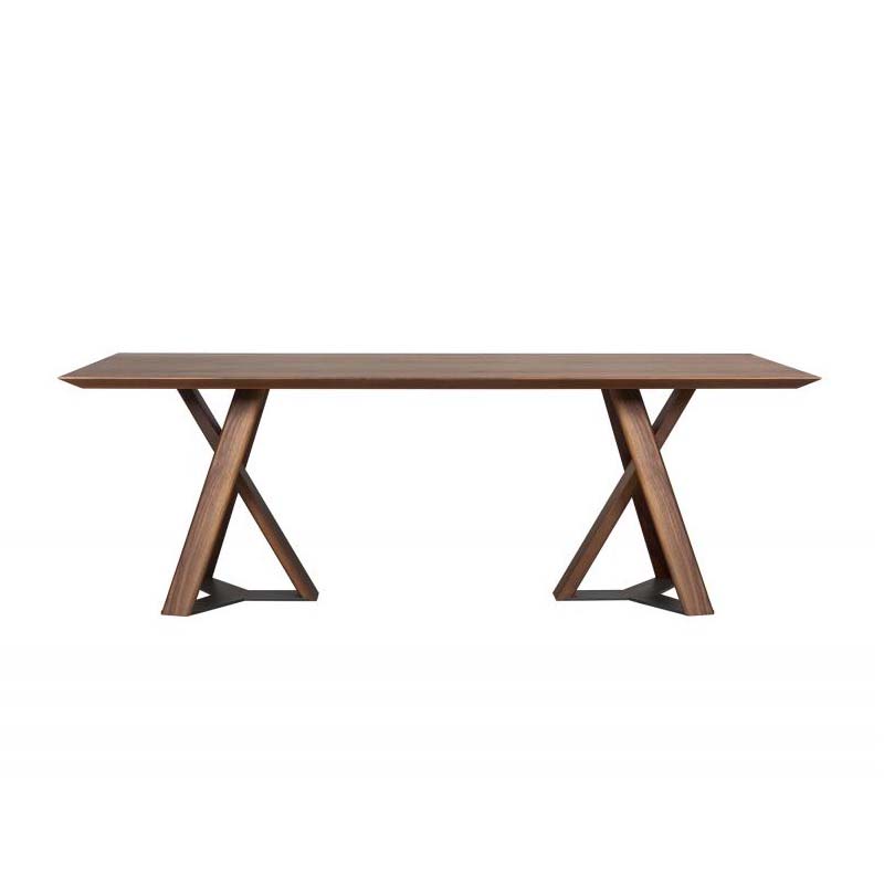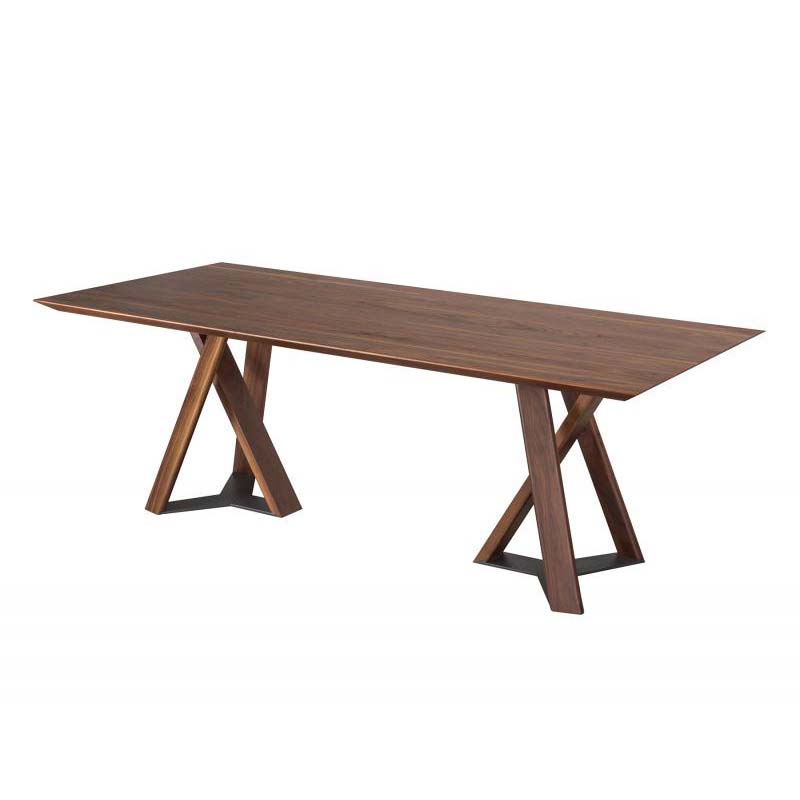 Τραπέζι με παραλληλόγραμμο φάλτσο καπάκι από καπλαμά ξύλου ή μασίφ ξύλο και βάση από μασίφ ξύλο με μεταλλική λεπτομέρεια.