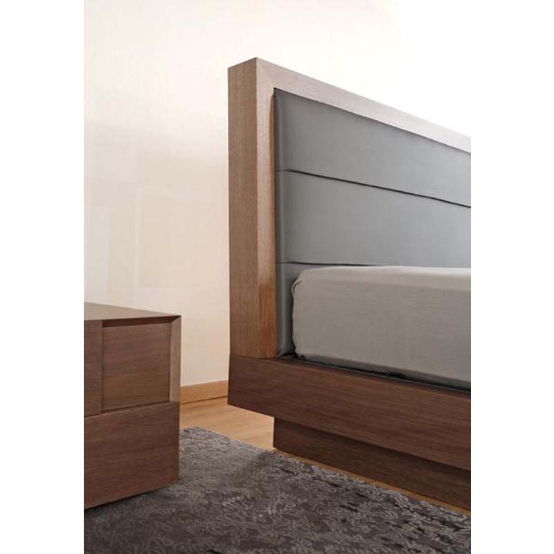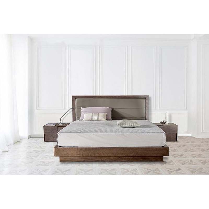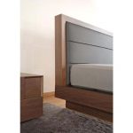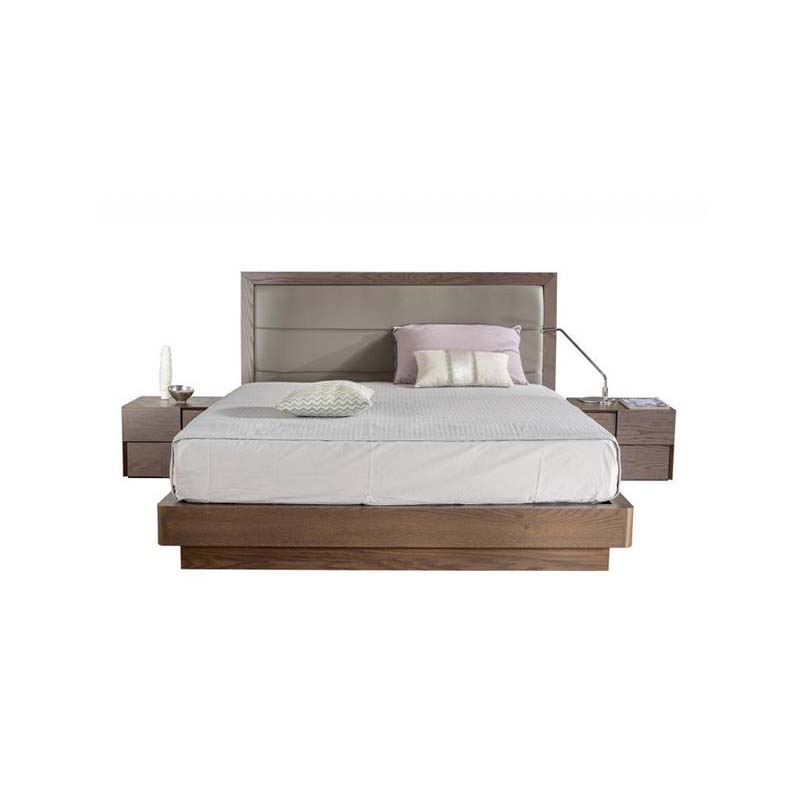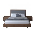 Κρεβάτι με βάση καπλαμά ξύλου ή λάκα και υφασμάτινο κεφαλάρι με ξύλινη λεπτομέρεια.