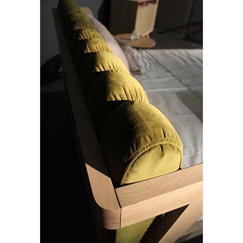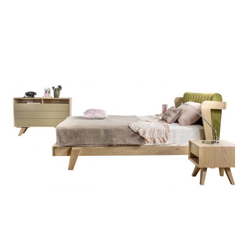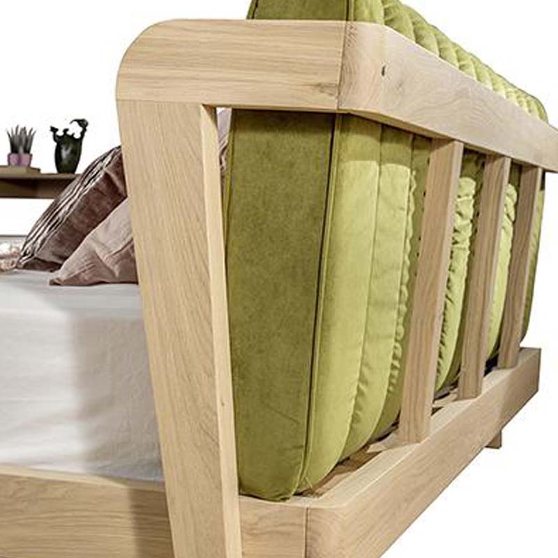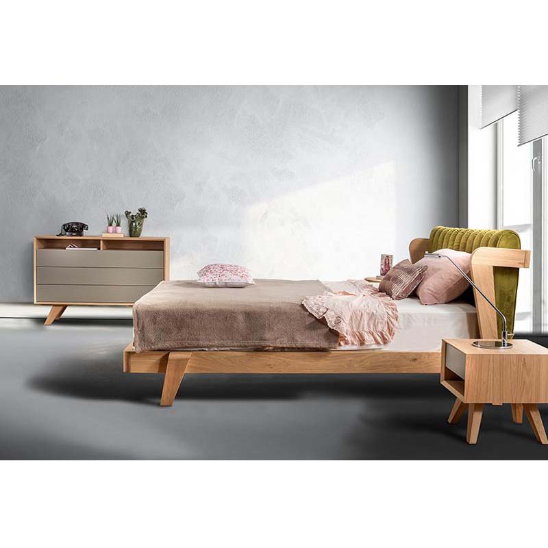 Κρεβάτι από μασίφ ξύλο με υφασμάτινο κεφαλάρι.