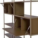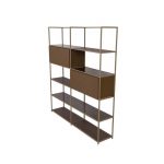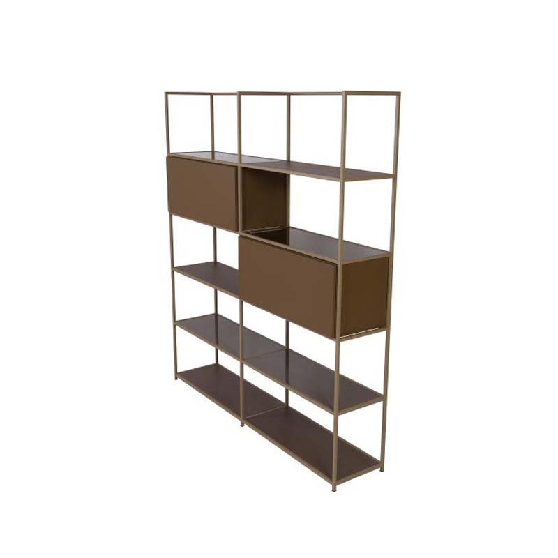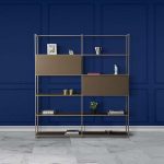 Βιβλιοθήκη με μεταλλικό σκελετό και ράφια σε καπλαμά ξύλου , γυαλί , κεραμικό maxfine ή λάκα.