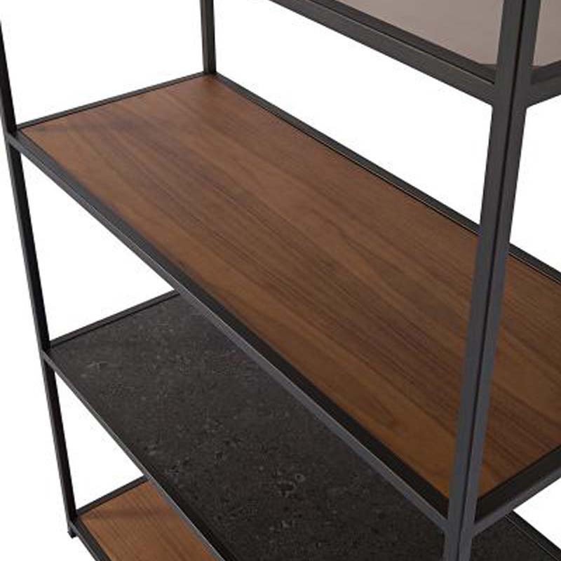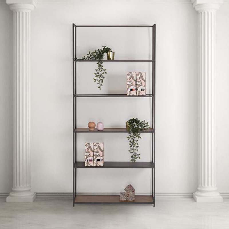 Βιβλιοθήκη με μεταλλικό σκελετό και ράφια σε καπλαμά ξύλου , γυαλί , κεραμικό maxfine ή λάκα.