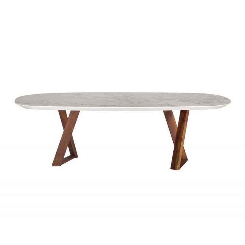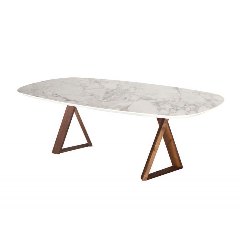Τραπέζι με οβάλ φάλτσο καπάκι από κεραμικό maxfine και βάση πάντα από μασίφ ξύλο.