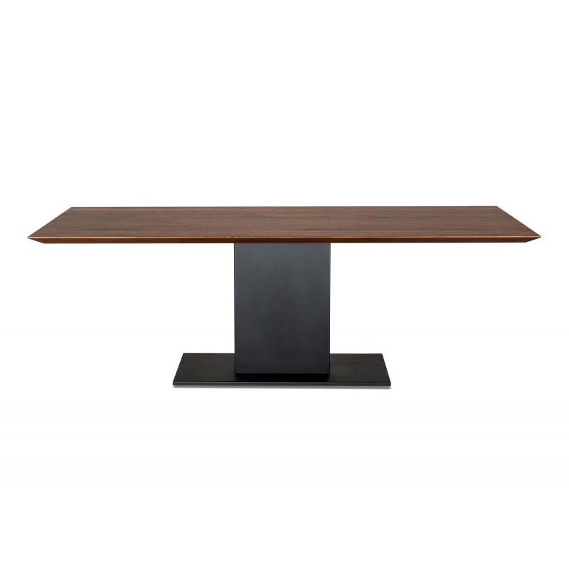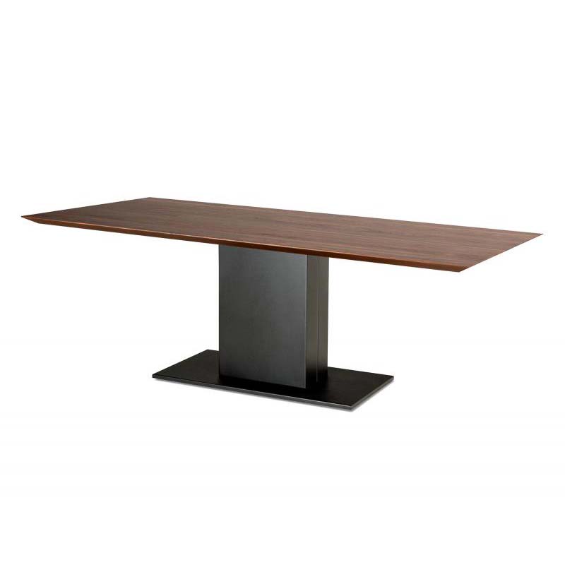 Τραπέζι με παραλληλόγραμμο φάλτσο καπάκι από καπλαμά ξύλου ή λάκα ή μασίφ ξύλο και μεταλλική βάση.