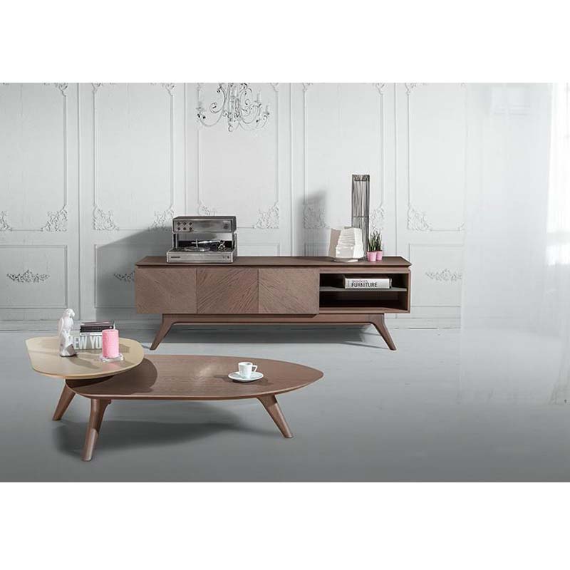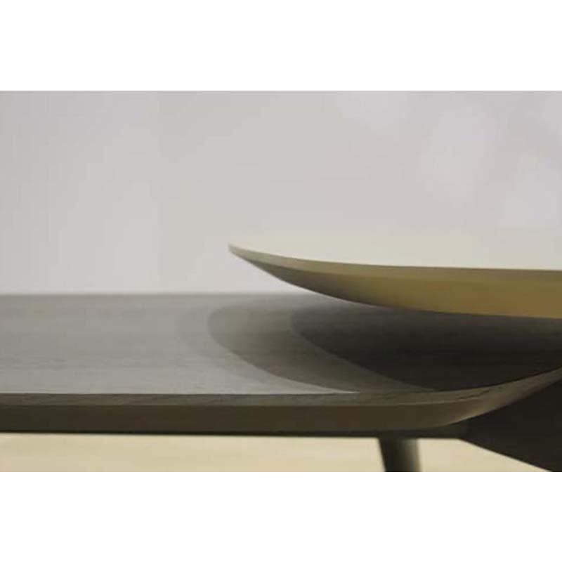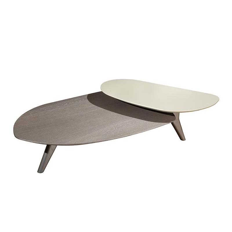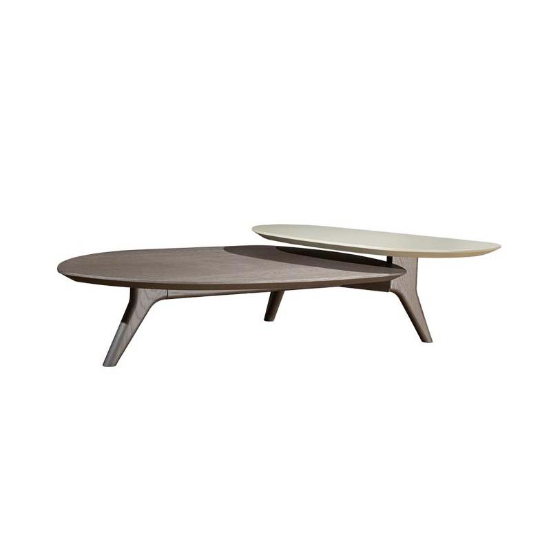 Τραπεζάκι σαλονιού δύο επιπέδων με καπάκι καπλαμά ξύλου ή λάκα και βάση μασίφ ξύλο.