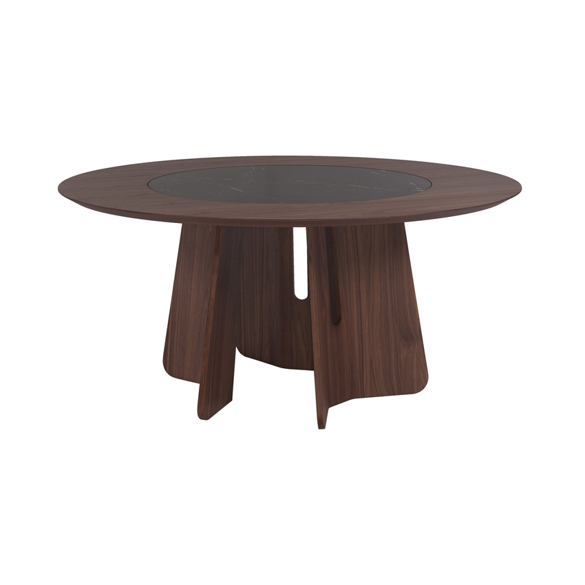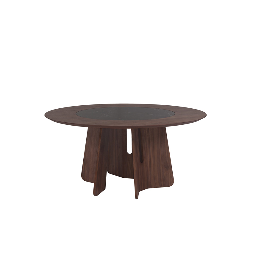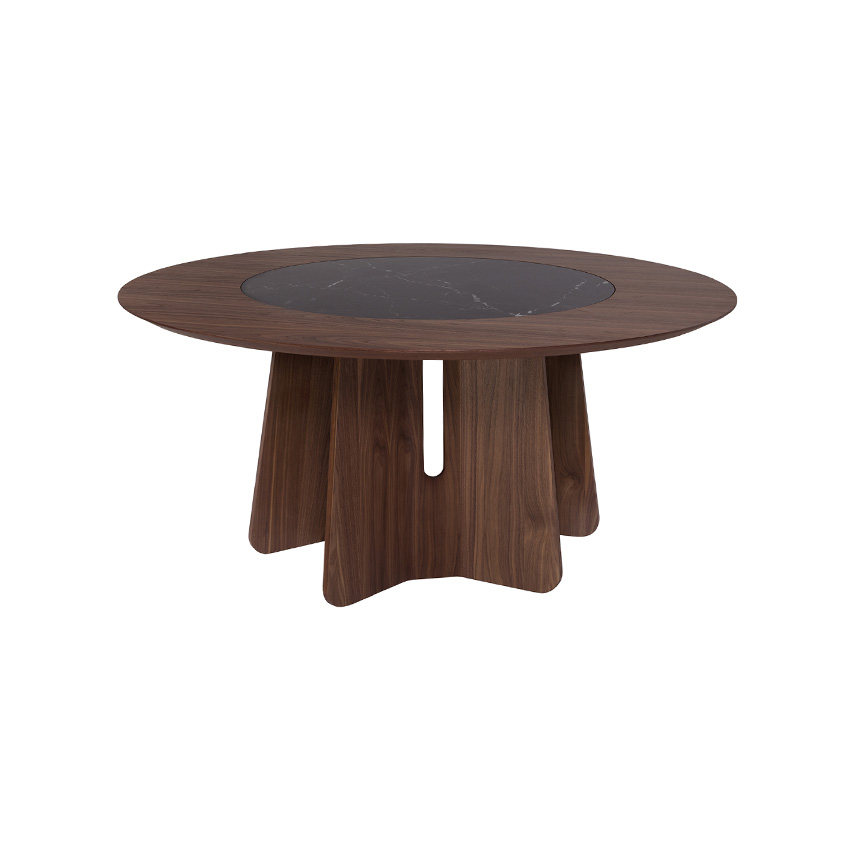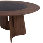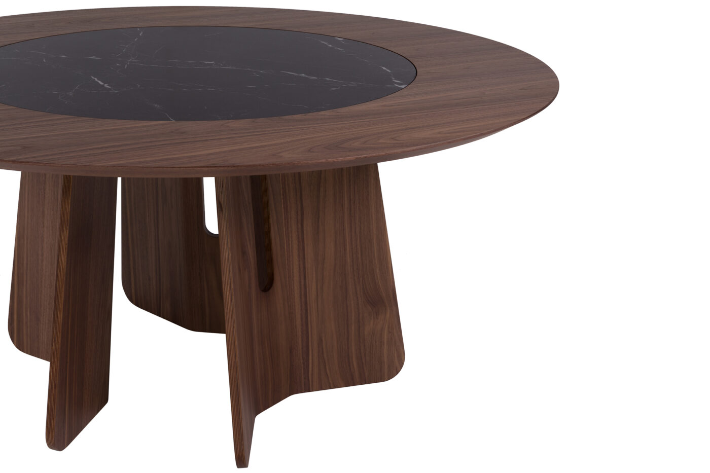 Τραπέζι με στρογγυλό φάλτσο καπάκι σε καπλαμά ή λάκα και maxfine κεραμικό στη μέση και ξύλινη βάση .