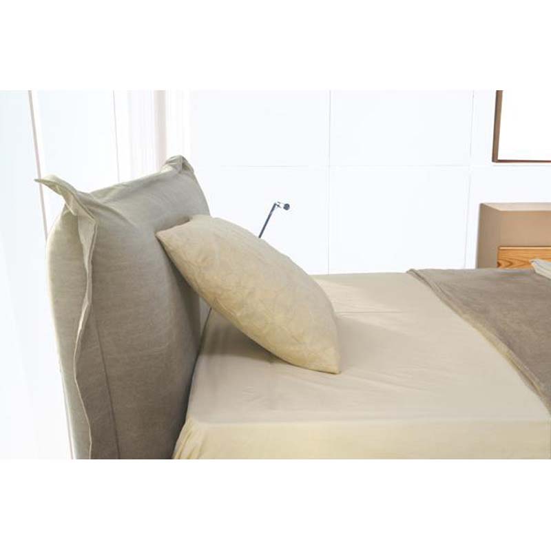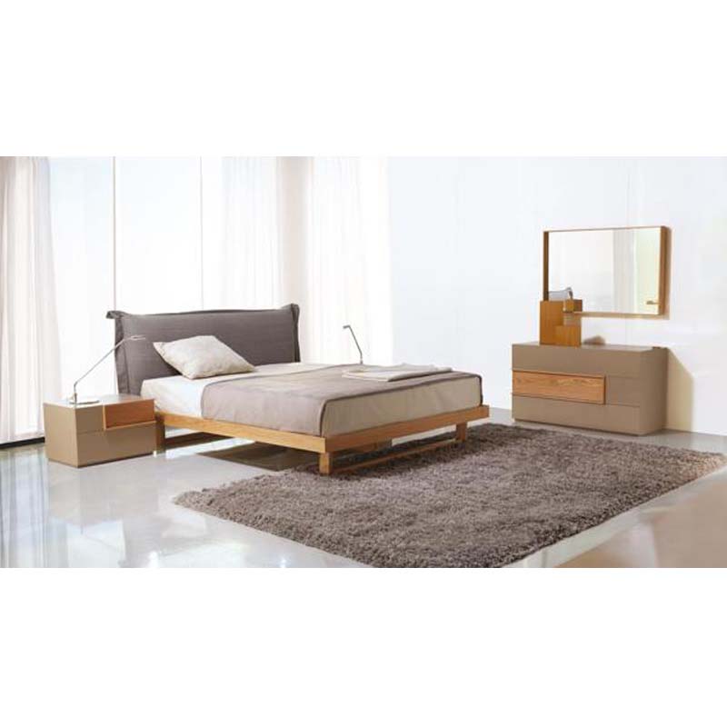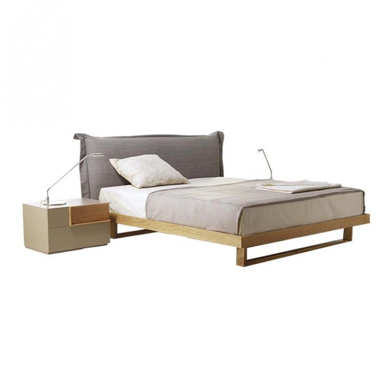 Κρεβάτι από μασίφ ξύλο με υφασμάτινο κεφαλάρι.