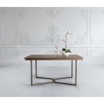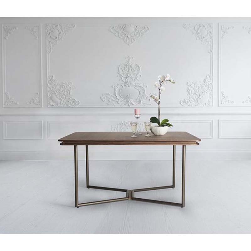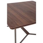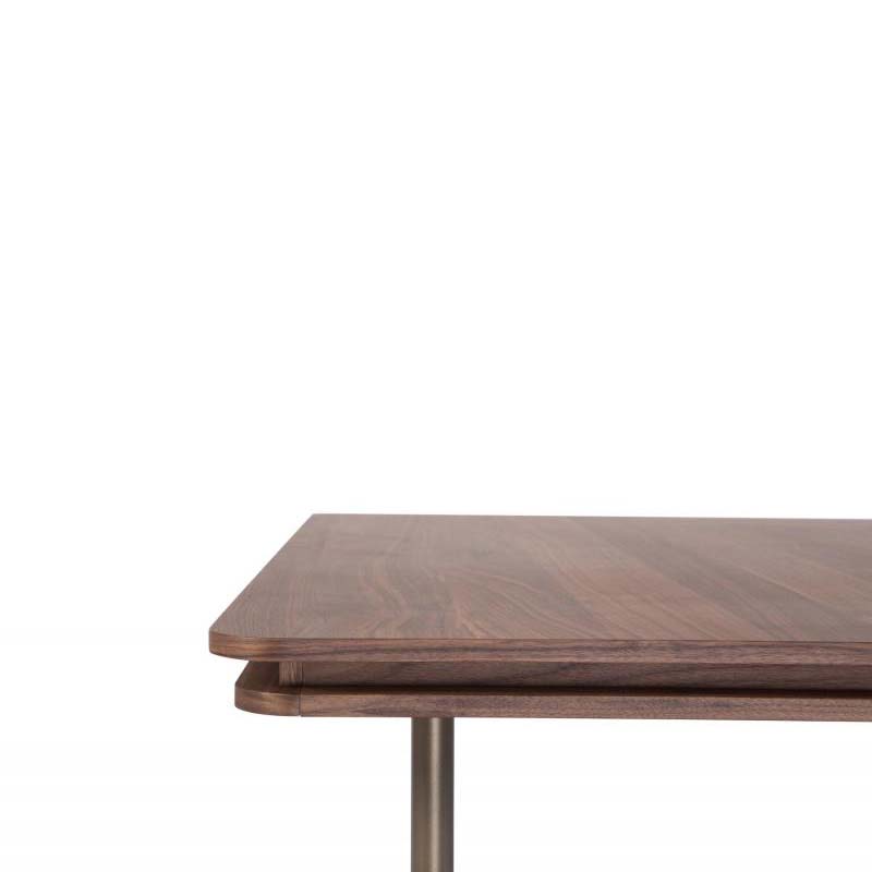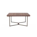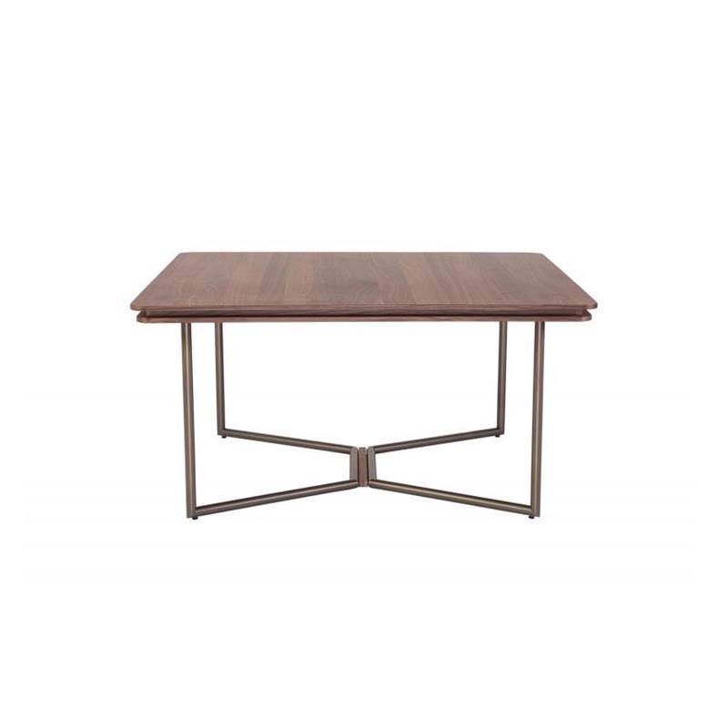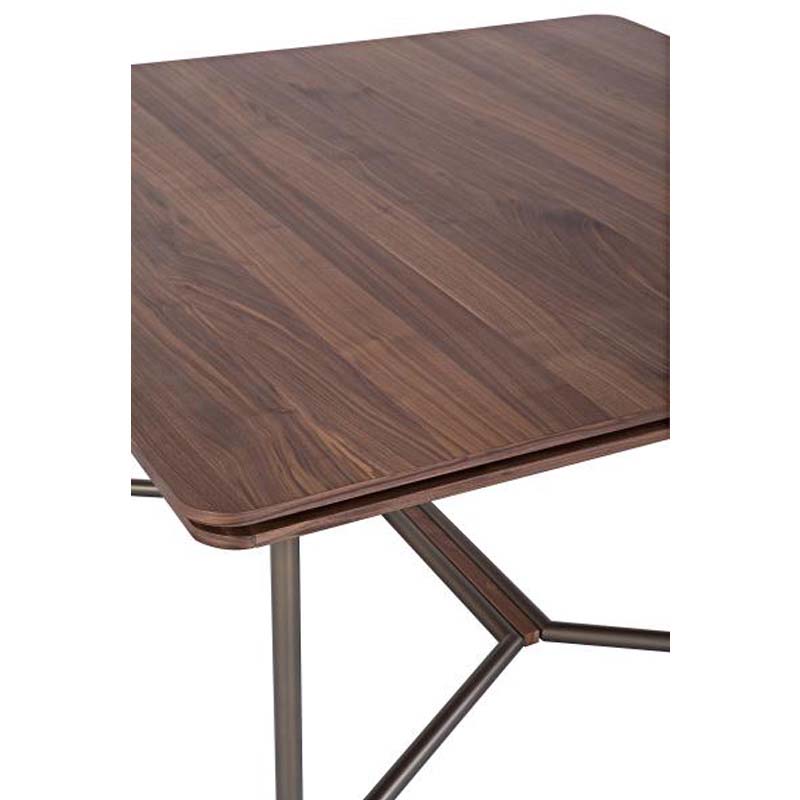 Τραπέζι με τετράγωνο καπάκι από καπλαμά ξύλου ή λάκα και μεταλλική βάση με ξύλινη λεπτομέρεια.