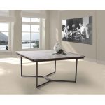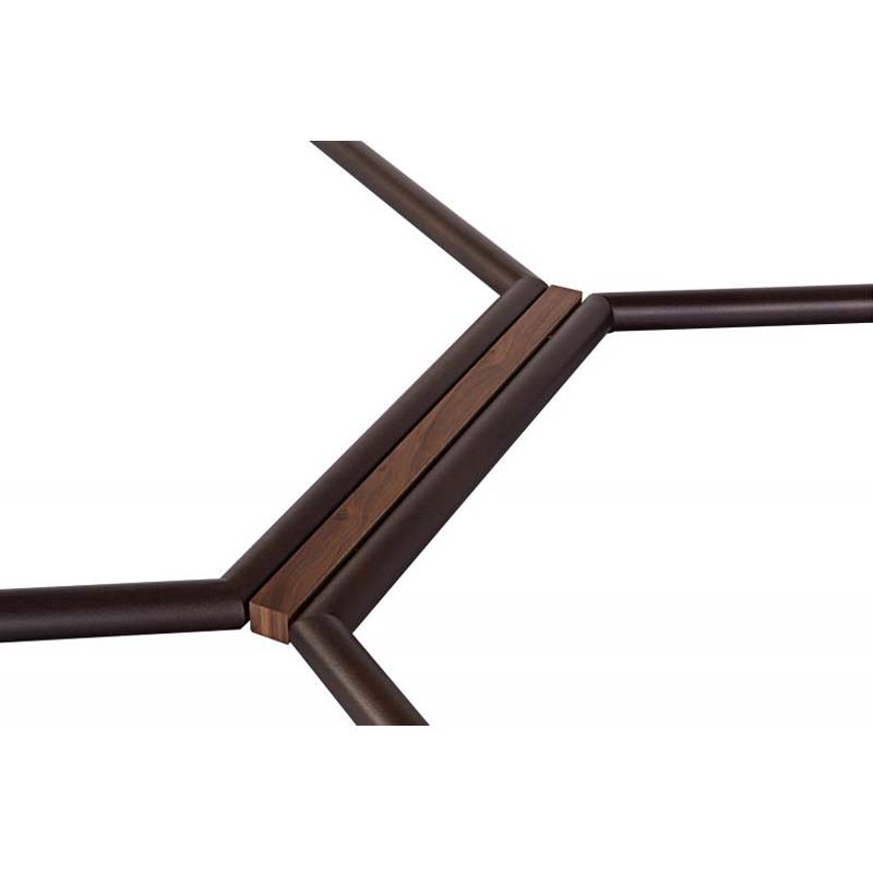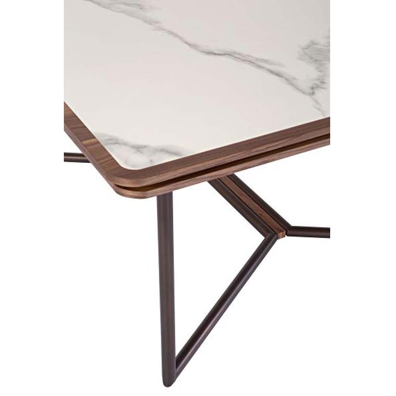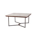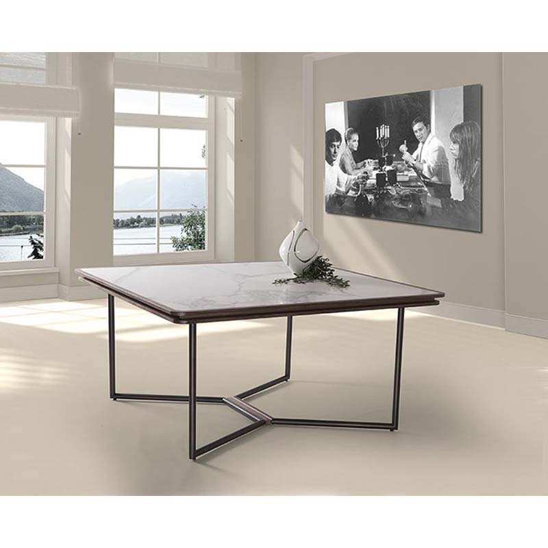 Τραπέζι με τετράγωνο καπάκι από καπλαμά ξύλου ή λάκα με κεραμικό maxfine και μεταλλική βάση με ξύλινη λεπτομέρεια.